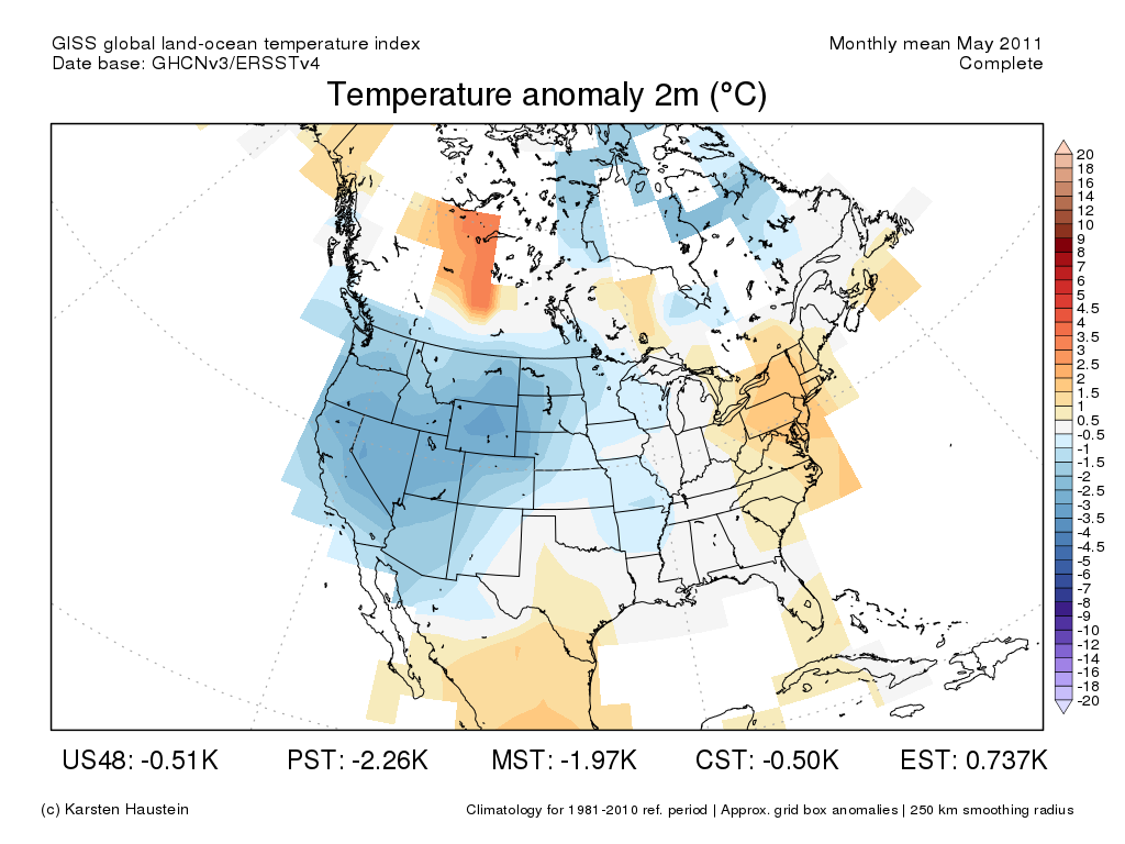 GISS land-ocean 2m air temperature anomalies May 2011 (North America)