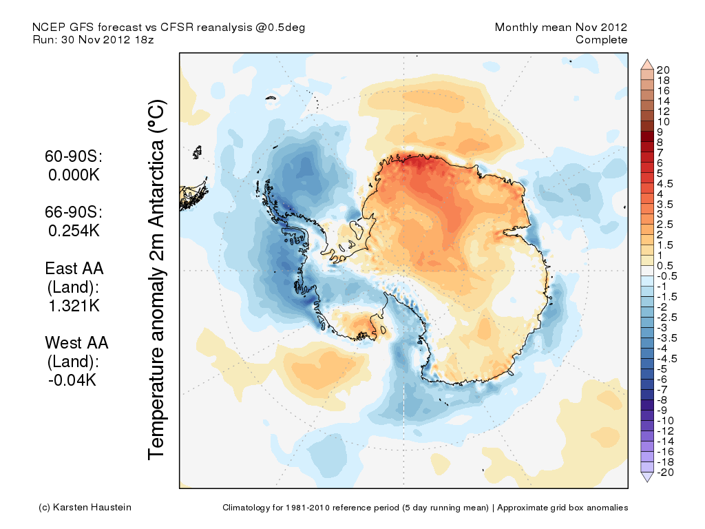 NCEP GFS 0.5deg monthly mean 2m air temperature anomalies Nov 2012 (Antarctica)