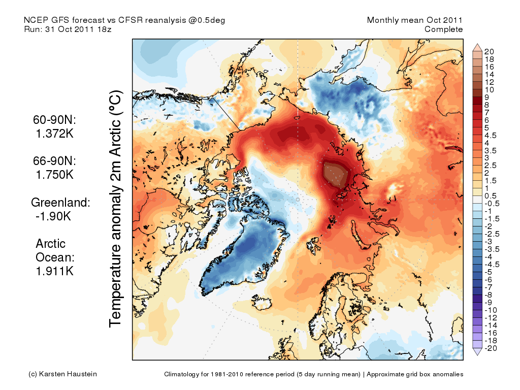 NCEP GFS 0.5deg monthly mean 2m air temperature anomalies Oct 2011 (Arctic)