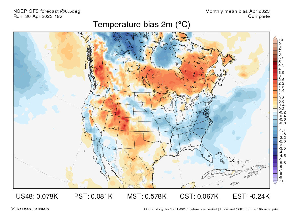 Rotating monthly mean 7 day GFS forecast bias for April (North America)