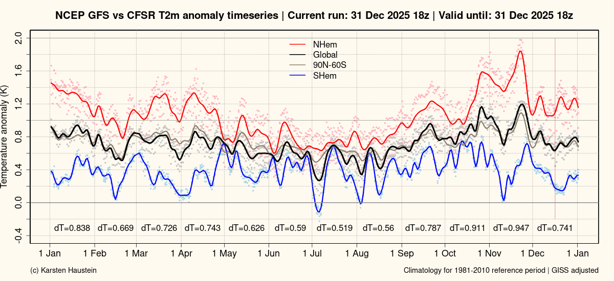 NCEP GFS 0.5deg analysis 2m air temperature anomaly timeseries (2025)