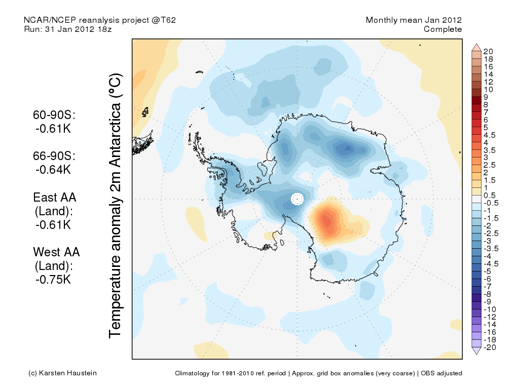 NCAR/NCEP T62 monthly mean 2m air temperature anomalies Jan 2012 (Antarctica)