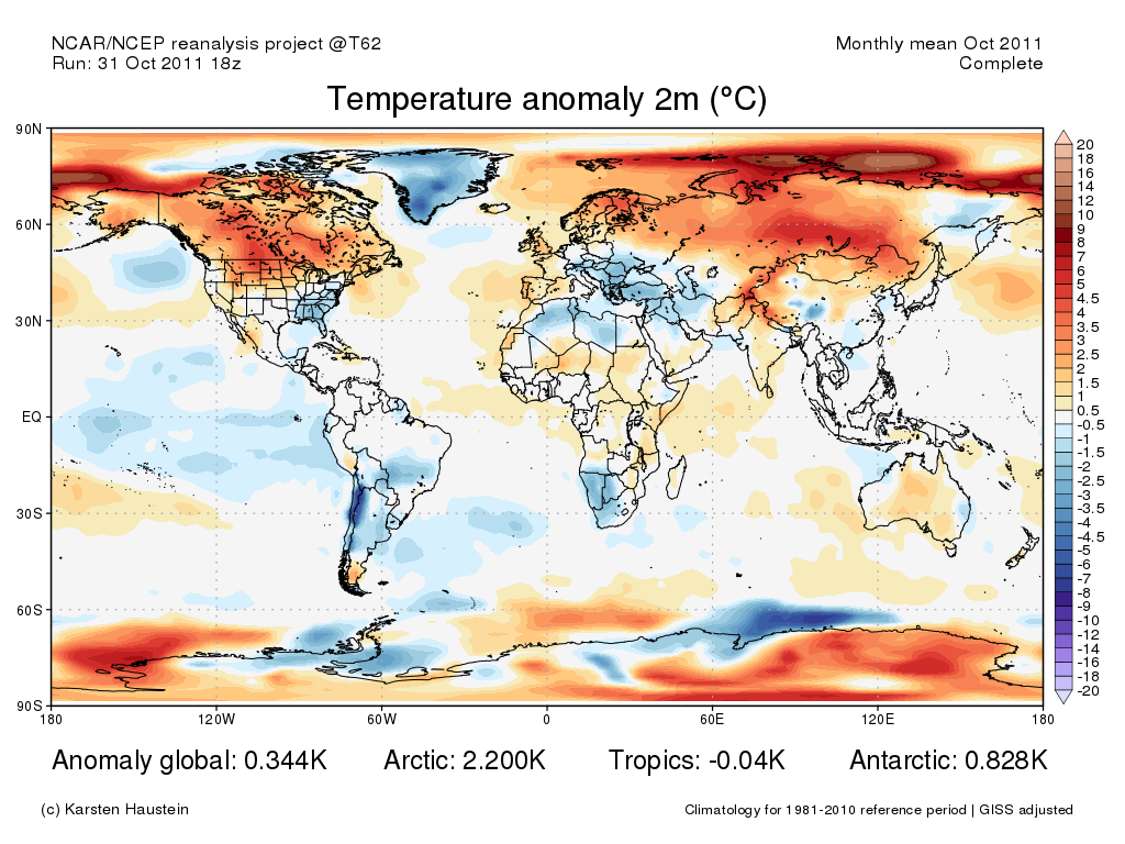 NCAR/NCEP T62 monthly mean 2m air temperature anomalies Oct 2011