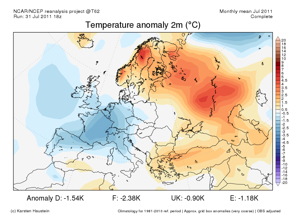 NCAR/NCEP T62 monthly mean 2m air temperature anomalies Jul 2011 (Europe)