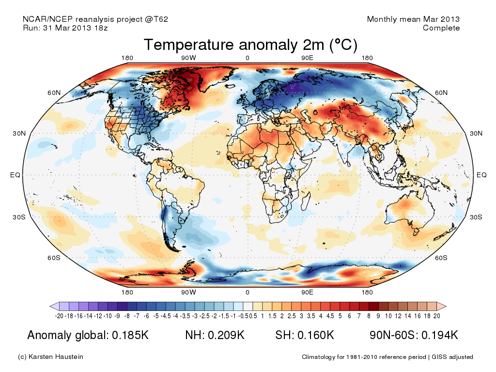 NCAR/NCEP T62 monthly mean 2m air temperature anomalies Mar 2013